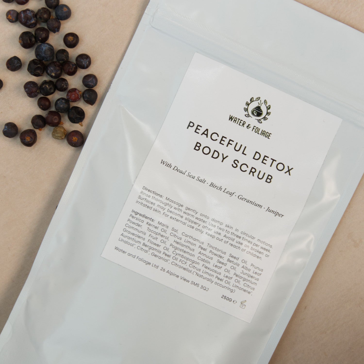 Maris Sal, Carthamus Tinctorius Seed Oil, Prunus Persica Kernel Oil, Citrus Limon Peel Powder, Betula Alba Leaf Powder, Tocopherol, Helianthus Annuus Seed Oil, Juniperus Communis Fruit Oil, Pogostemon Cablin Leaf Oil, Pelargonium Graveolens Flower Oil, Cymbopogon Flexuosus Leaf Oil, Citrus Aurantium Bergamia Peel Oil FCF, Citrus Limon Peel Oil, Limonene*, Linalool*, Citral*, Geraniol*, Citronellol.(*Naturally occurring)